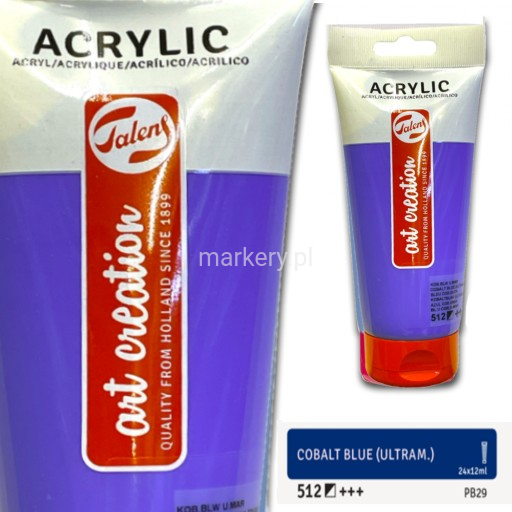 Talens Art Creation Farba Akrylowa 200 ml Cobalt Blue Ultramarine 512 Farba akrylowa Art Creation 200mlwytwórcą farb akrylowych Art Creation jest uznana Holenderska firma Royal Talensjest to produkt, który charakteryzuje wysoka jakość oraz przystępna cenapaleta barw obejmuje 24 nasycone kolory o wysokiej światłotrwałościponieważ skłąd opiera się na żywicy akrylowej są bezpieczne dla środowiskakonsystencja farb jest gęsta, dzięki czemu możliwe jest tworzenie w technice impastomogą być nakładane za pomocą pędzla prosto z opakowania bądź w razie potrzeby być rozcieńczane za pomocą wodyfarby te świetnie pokrywają dobrze oczyszczone powierzchnie o dużej chłonnościmożna malować nimi nie tylko na płótnie czy papierze, ale także na gipsie, drewnie, kamieniu czy cemenciefarby szybko schną co pozwala na nakładanie kolejnych warstw w niedługich odstępach czasupo wyschnięciu warstwa farby jest wodoodpornaopakowani: tubka 200mlcena za jedną sztukę