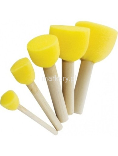 Pędzle wykonane z gąbki, przeznaczone do nakładania farby lub innych mediów artystycznych. Posiadają drewniany uchwyt ułatwiający ich aplikację. Szczególnie są przydatne w technice decoupage do tworzenia różnych efektów, a także nakładania kleju. Przeznaczone do wielokrotnego użytku. Umyć po użyciu za pomocą dowolnego detergentu.Dostępne w zestawie 5 różnych rozmiarów.