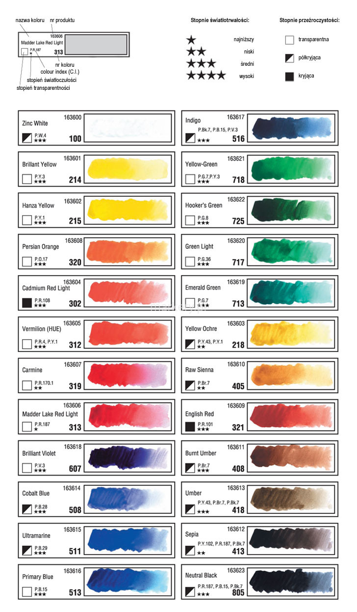 - odznaczają się wysoką jakością składników dużą światłotrwałością przeźroczystością. jasnymi i czystymi tonami, niską siłą pokrycia podłoża