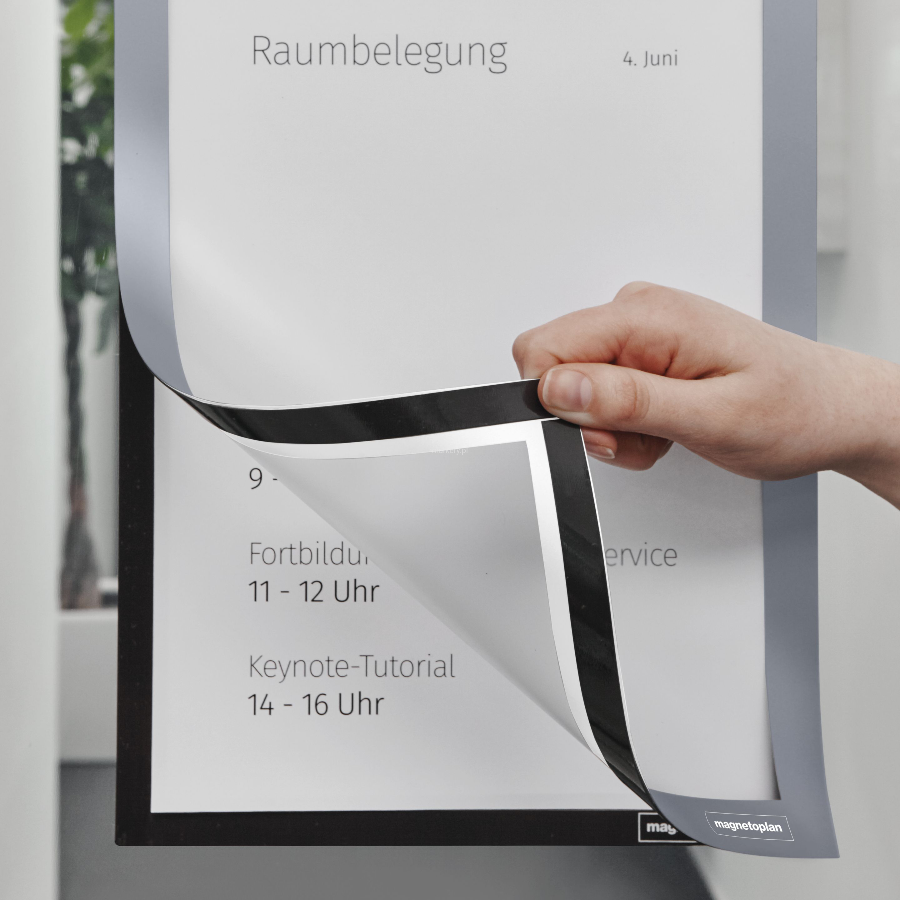 Magnetoplan ramka magnetyczna samoprzylepna 2 szt srebrny A4 Dwustronna ramka informacyjna na zawiasach w 6 stylowych kolorach, po 2 sztuki. Umieszcza dokumenty, obrazy + zdjęcia w jak najlepszym widoku + nadaje im odpowiednią oprawę. Nadaje się również do informacji operacyjnej w biurze, magazynie + produkcji oraz do tablic informacyjnych TQM. Samoprzylepne z tyłu, dzięki czemu ramka informacyjna pewnie przylega do wszystkich gładkich powierzchni, takich jak metal, płytki, plastik, drobny tynk itp. Na szkle ramki i dokumenty są widoczne nawet z obu stron, jeśli załadowana jest przednia i tylna strona. Można go usunąć bez pozostawiania śladów i można go elastycznie używać do regularnej wymiany dokumentów. Może być używany w formacie pionowym i poziomym.Szybka i łatwa wymiana dokumentów dzięki wszechstronnemu zamknięciu magnetycznemu: podnieś róg - zmień dokument - puść róg - GOTOWE! Zestaw 2 samoprzylepnych ramek informacyjnych Przykleja się do wszystkich gładkich powierzchni Może być używany elastycznie Materiał: Polipropylen (PP) Zgodne z REACH.
