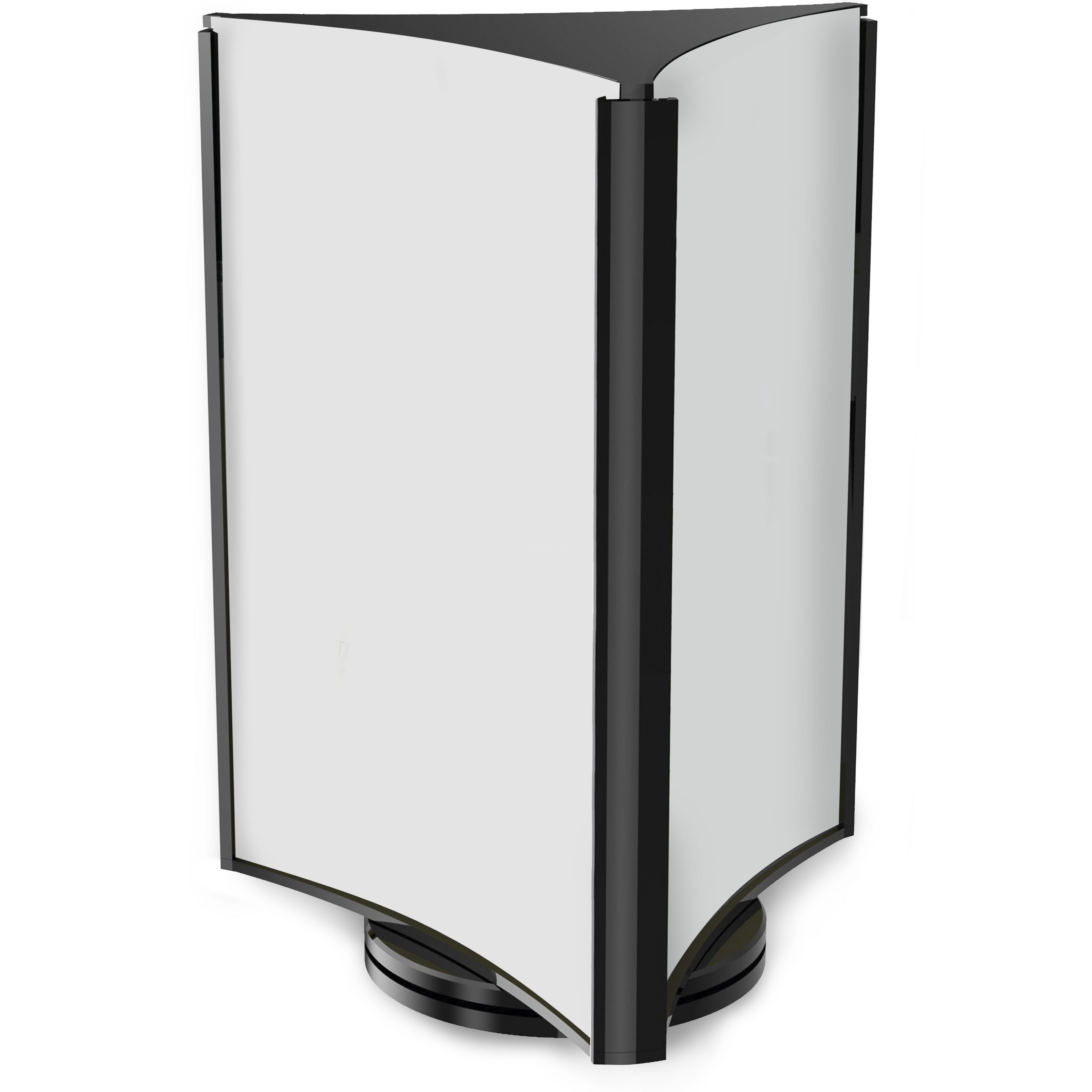 Płynny ruch obrotowy umożliwia oglądanie wkładek z trzech stron, co zapewnia maksymalny efekt. Idealny do ekspozycji w restauracjach, hotelach i innych miejscach związanych z usługami. Podstawa wykonana z polistyrenu, boki z PMMA, stelaż z czarnego PCV. Rozmiar: 165 x 230 x 165 mm (szer. x wys. x gł.).
